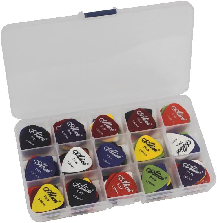 Amazon Com 100pcs Bass Rock Heavy Metal Guitar Picks Plectrum Variety Colors Assorted Gauge Heavy 0 96 1 2 1 5mm 15 Grid Case Organizer Box Musical Instruments